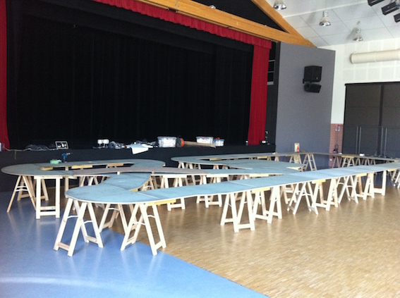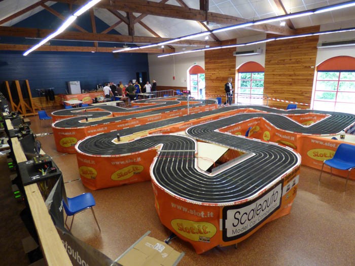 La piste : C’était une course de type ANALOGIQUE, donc une piste à plusieurs voies est nécessaire (1 par auto). A Chatillon en Diois, l’organisateur David M., avait prévu 2 pistes identiques placées cote à cote en miroir, avec 8 voies chacune. Cela permet de faire courir 16 pilotes en même temps qui tour à tour vont faire des « runs » de 12 mn puis permuter de pistes en pistes et de circuits, mais aussi aller au ramassage et ce pendant 2 demi journées .
