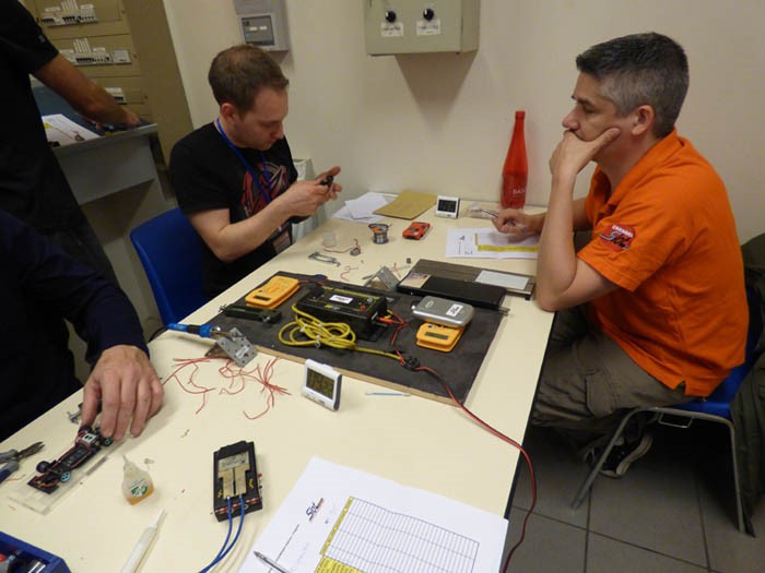 Les pilotes sont sur les deux podiums en face des pistes et branchent leur poignée de commande sur le boitier correspondant à la piste qui leur est attribuée. Au top départ de l’ordinateur de control la tension est présente et les autos peuvent rouler. Au top de fin (ici après 12 mn), la tension se coupe et les autos restent à leur place. L’ordinateur a compté les tours uniquement. Certains pilotes vont se déplacer pour changer de piste, leur auto est placée sur une autre piste à la même place sur le circuit. Certaines vont être enlevées et leur emplacement marqué par un numéro. Et d’autres pourront prendre leur départ. Et ainsi de suite pendant la course (sur les 2 jours). Le vainqueur aura parcouru le plus grand nombre de tours accumulés sur toutes les pistes.