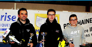 CORZE le 18/01/15 ligue 17, TT 1/10 4x2 mod 38 inscrits. Steve ne se contente plus du 1/10 piste électrique, il pratique aussi le 1/10 TT électique et s’inscrit en 4x2 modifié. Après de belles qualifications, il se classera 3ème. En ce qui concerne les finales, il terminera 3ème au général après avoir manqué de 5/100 ème la 2ème place du podium.