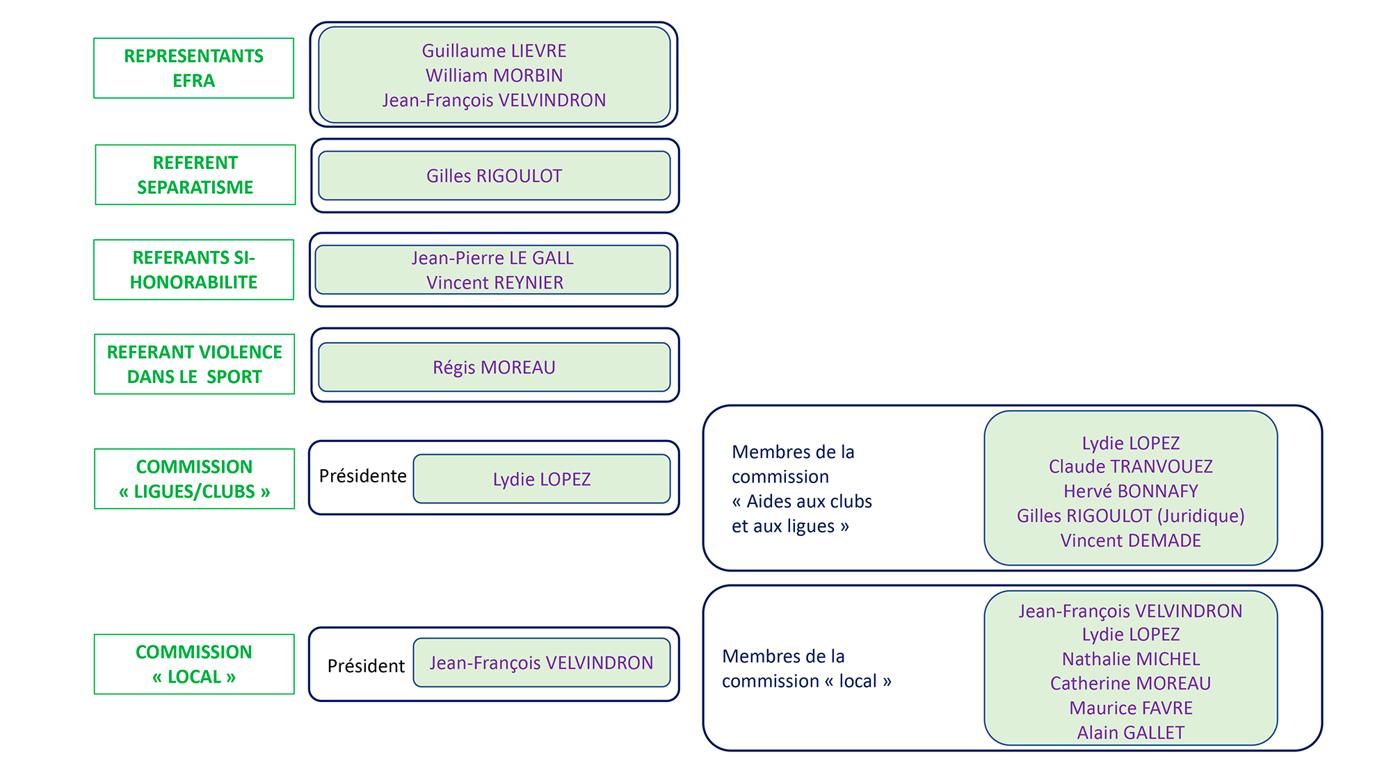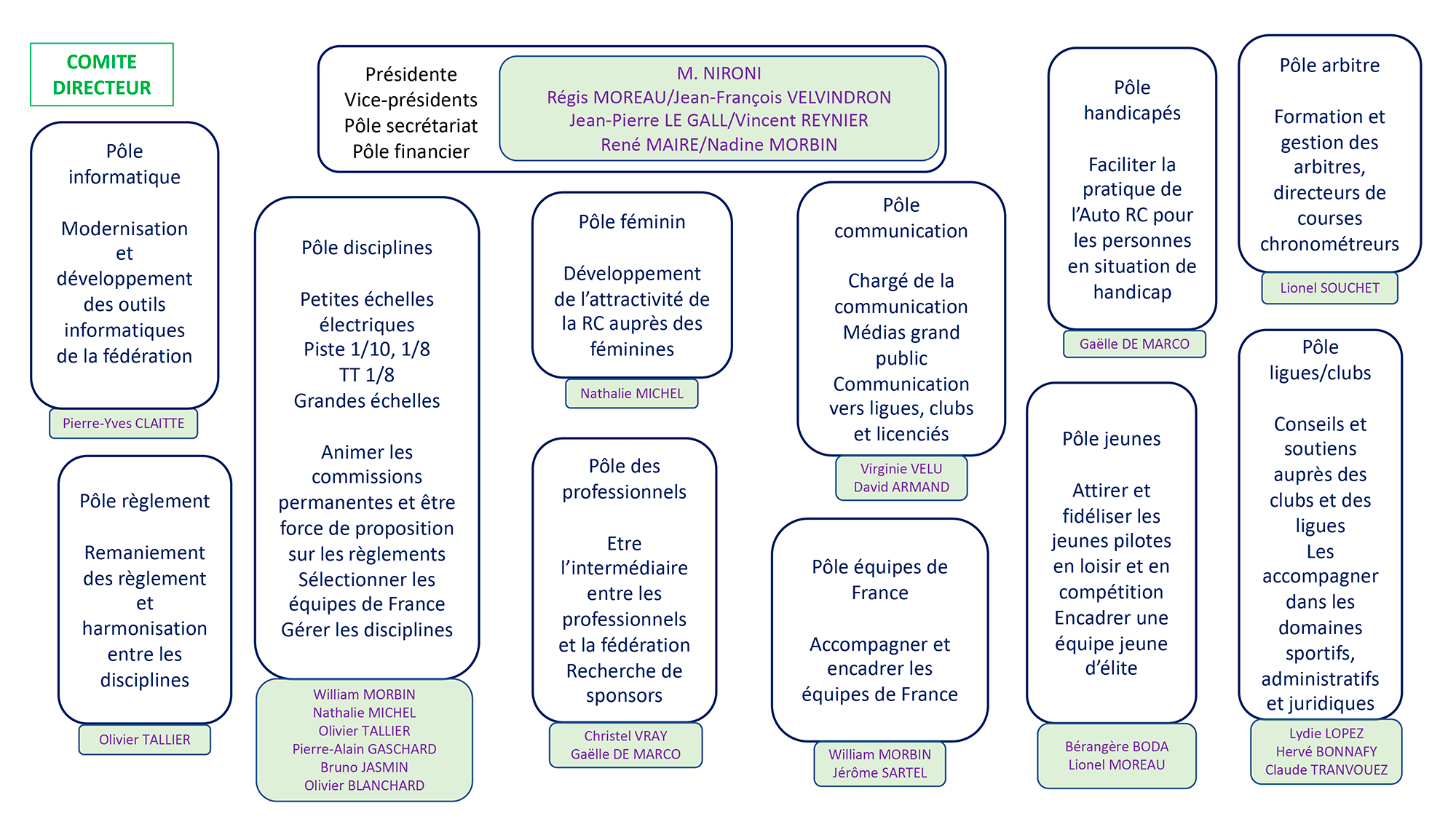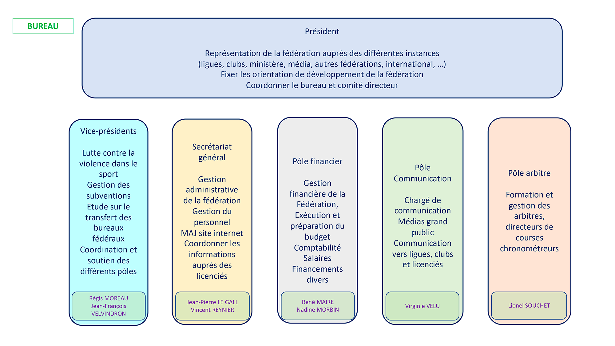 Pour rendre notre Comité Directeur plus participatif, ouvert vers sa base, il est organisé en grand domaine de compétences structurelles et sportives. Il est constitué de pôles